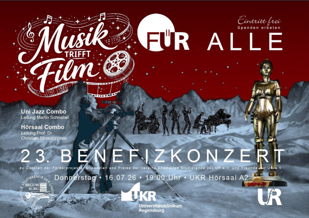 am 16. Juli 2026 findet im grossen Hörsaal des Uniklinikums unser Benefizkonzert 2026 unter dem Motto Musik trifft Film mit Bildern aus Filmklassikern und der Musik der Uni Jazz Combo unter der Leitung von Martin Schnabl sowie der Hörsaal Combo unter der Leitung von Prof. Stroszczynski statt.